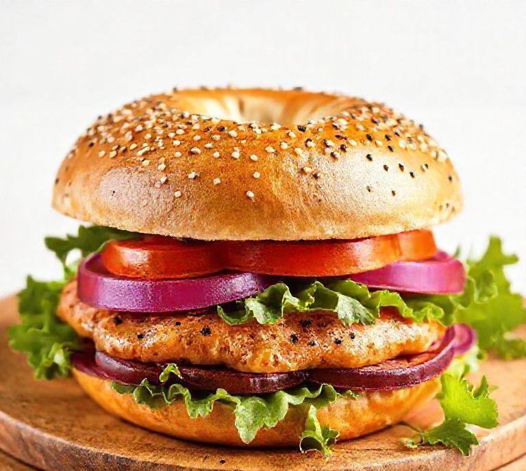 A vegetarian bagel sandwich usually includes a bagel of your choice, such as plain, whole wheat, or everything bagel, and a variety of fresh vegetables like lettuce, tomatoes, cucumbers, and avocados. Popular spreads include cream cheese, hummus, or pesto. Additional protein sources can be added, such as sliced cheese, tofu, tempeh, or plant-based deli slices, along with optional toppings like sprouts, pickles, or olives.