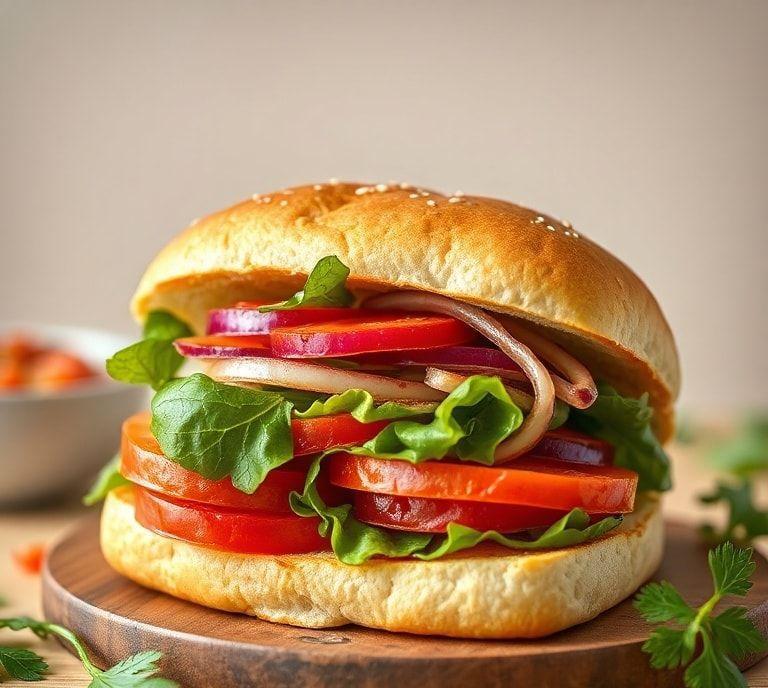 A vegetarian Banh Mi sandwich typically includes ingredients like a baguette, pickled vegetables (carrot, daikon), cilantro, cucumber, jalapeño, and a variety of plant-based fillings. Common fillings include marinated tofu, tempeh, or soy-based mock meats. The sandwich is also complemented with a spread like vegan mayo or hoisin sauce, and sometimes vegan pate for an extra layer of flavor.