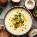 Vegetarian fufu can be served with a variety of plant-based soups and stews, such as egusi soup with mushrooms, okra soup with vegetables, or groundnut (peanut) soup made with legumes and leafy greens. To eat, break off small pieces of fufu, roll them into balls, and dip them into the soup or stew. This pairing provides a satisfying and balanced meal rich in carbohydrates, protein, and fiber.
